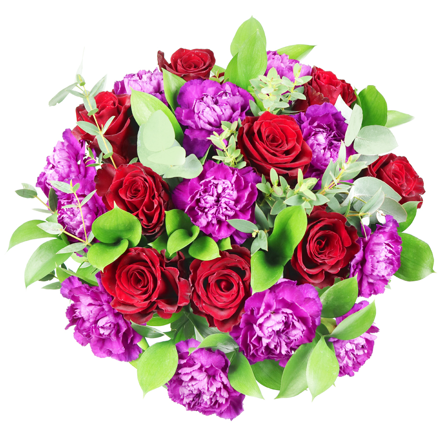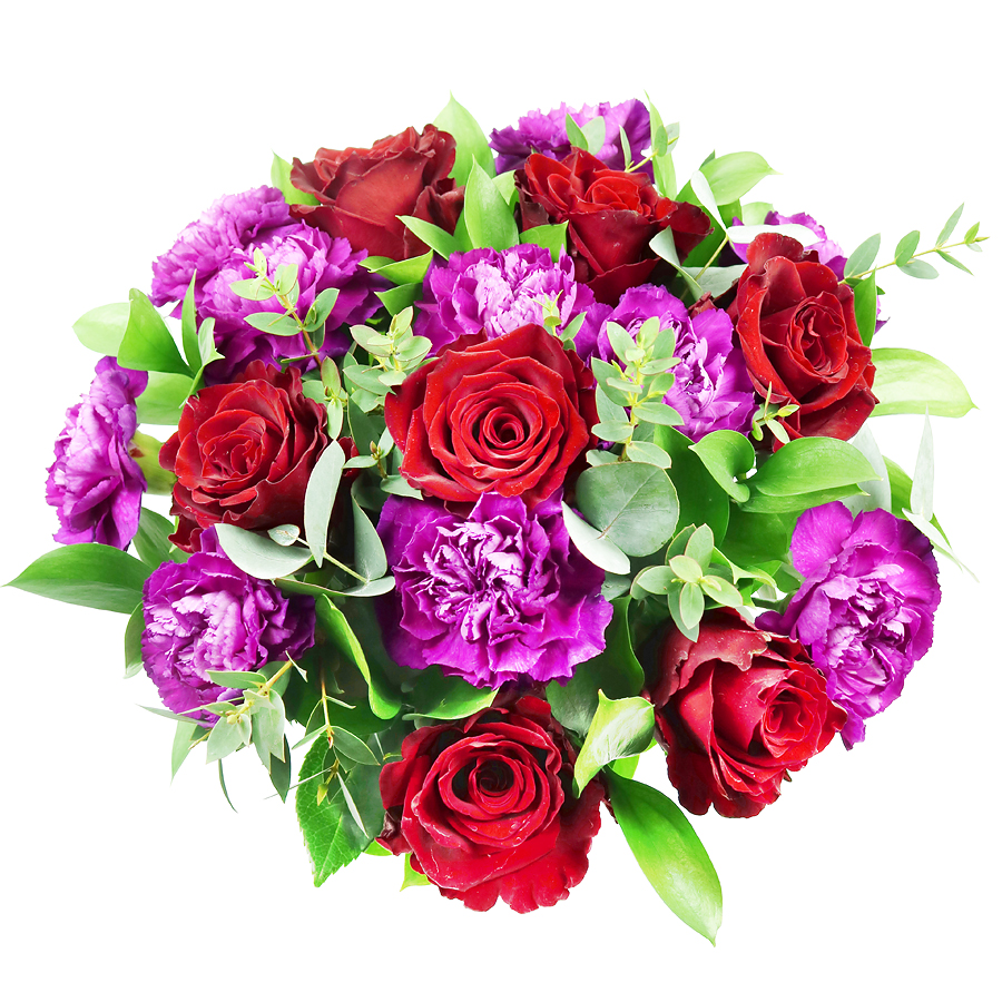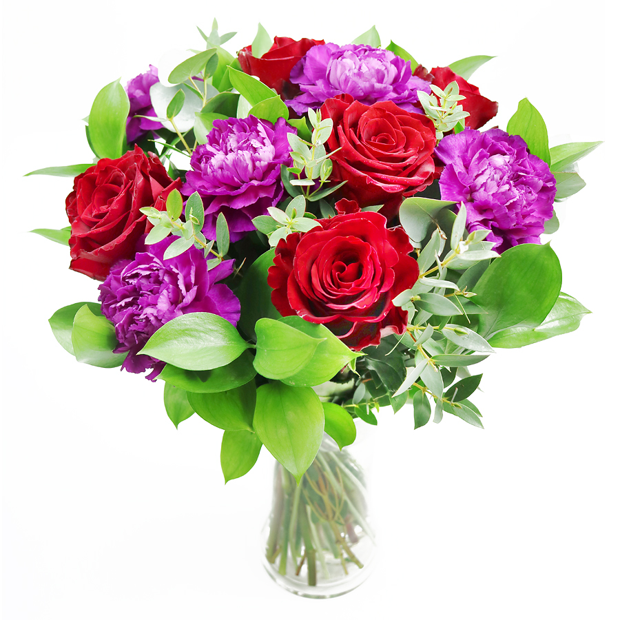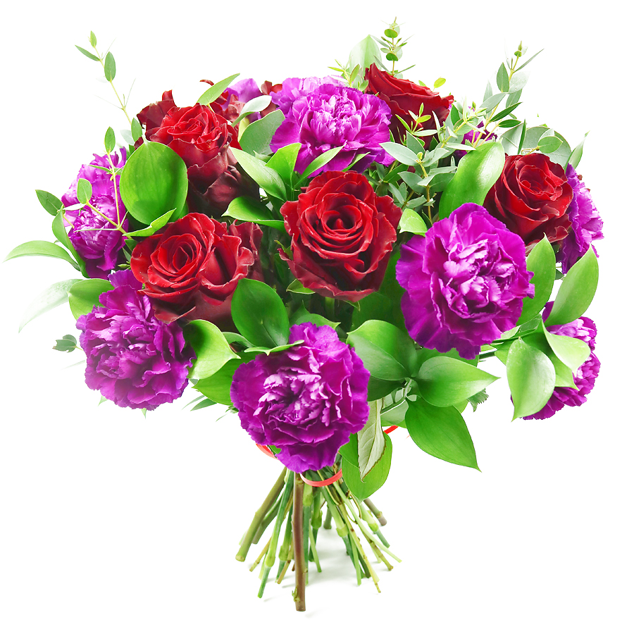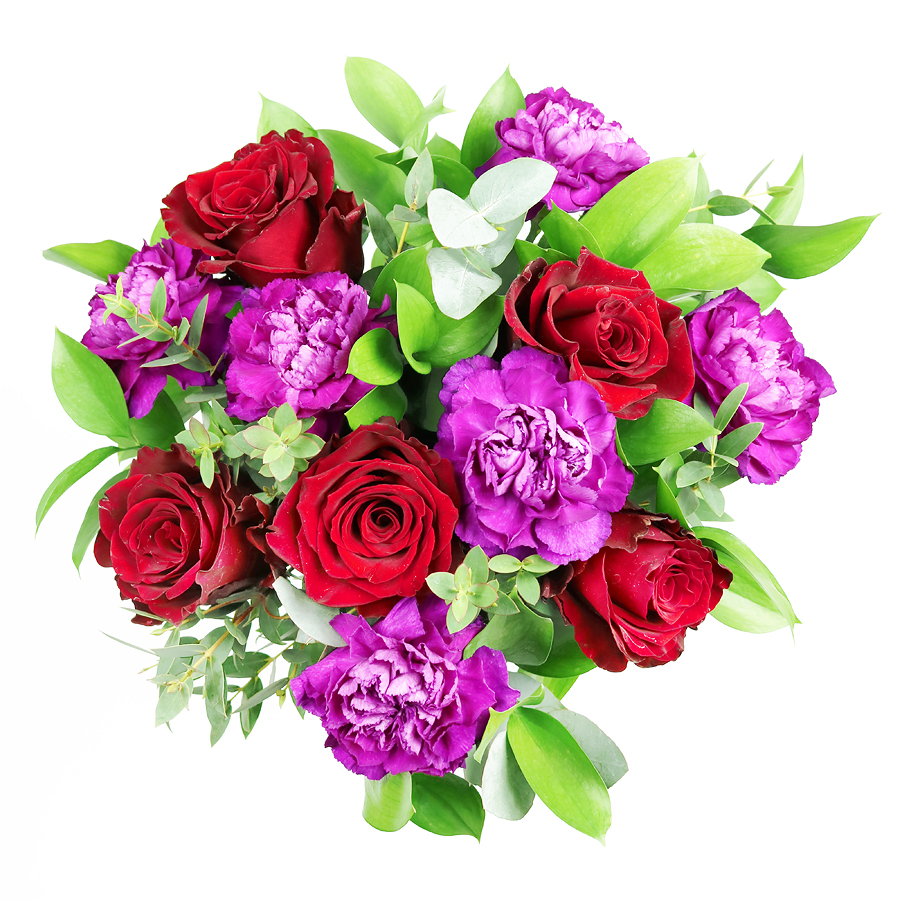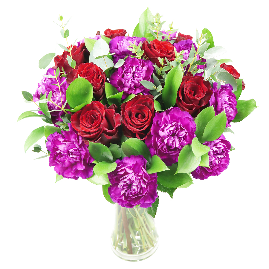 Our enchanting bouquet features a harmonious mix of red roses and cerise carnations, complemented by elegant ruscus and aromatic eucalyptus. Every flower is hand-selected to ensure peak freshness and stunning appearance, making it a perfect gift to express your love and admiration.